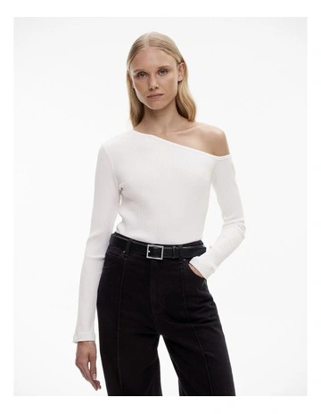 Cotton Blend Rib Asymmetric Top in Pure White