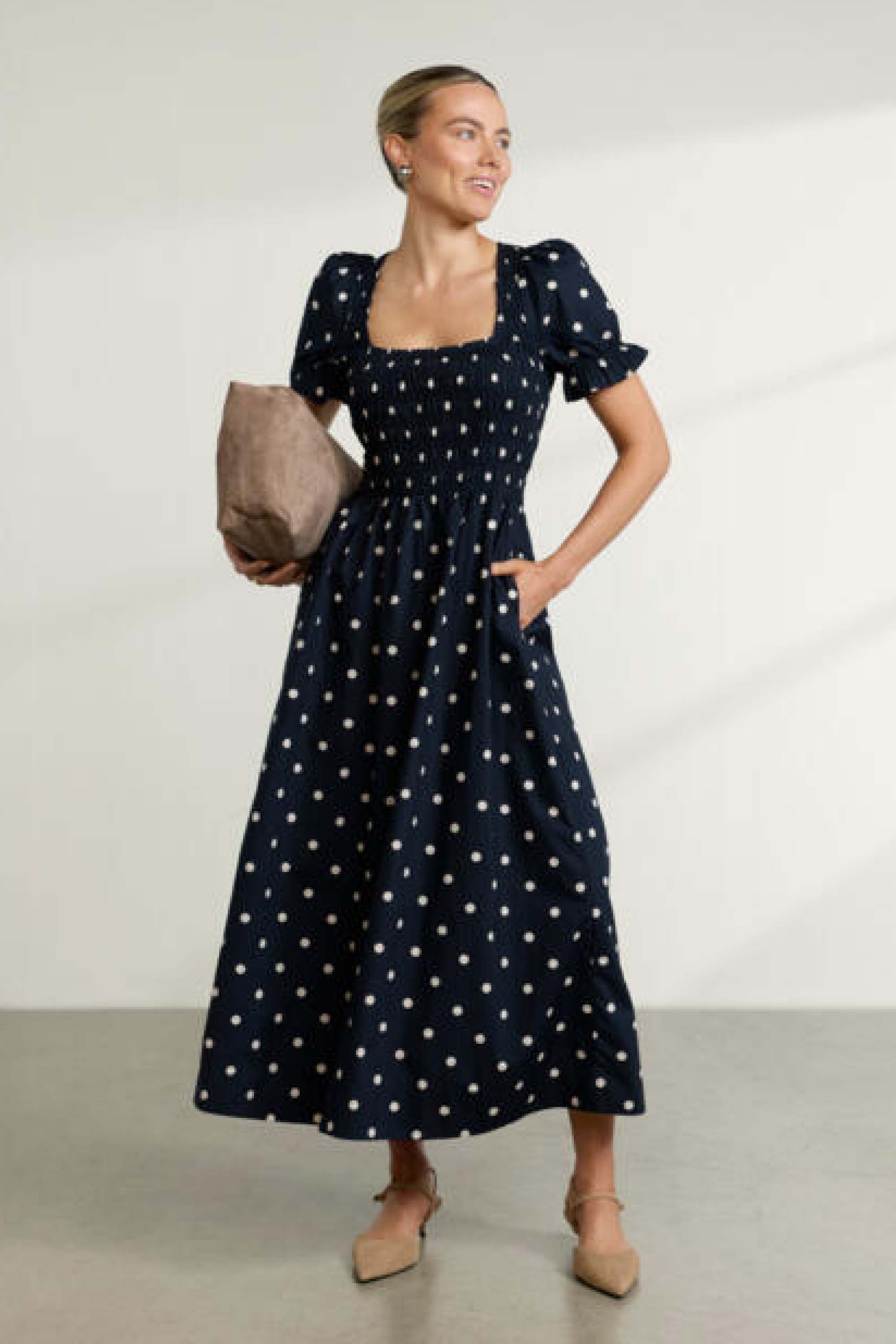 Gathered Detail Midi Dress in Atlantic and Black Spot Print