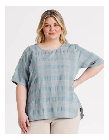 Organic Cotton Blend Short Sleeve Top with Curved Hem in Blue/Neutrals Textured Check