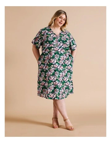 Regatta Curve European Linen Blend V Neck Short Sleeve Dress in Green/pinks Floral Print