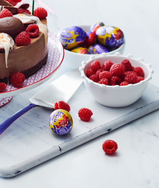 Remove the cheesecake from the pan and place onto a serving plate. Top with halved CADBURY CREME EGG® chocolate eggs and raspberries.