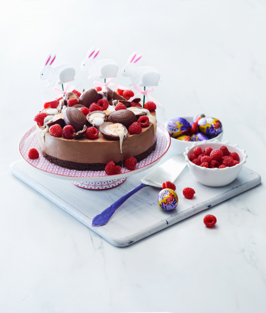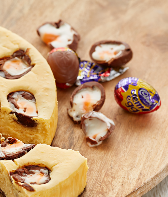 Beat the cream cheese and sugar with an electric mixer until just smooth. Beat in the eggs then stir through the sour cream and chocolate. Pour the filling into the prepared base and arrange the CADBURY CREME EGG® chocolate eggs around the cheesecake.
