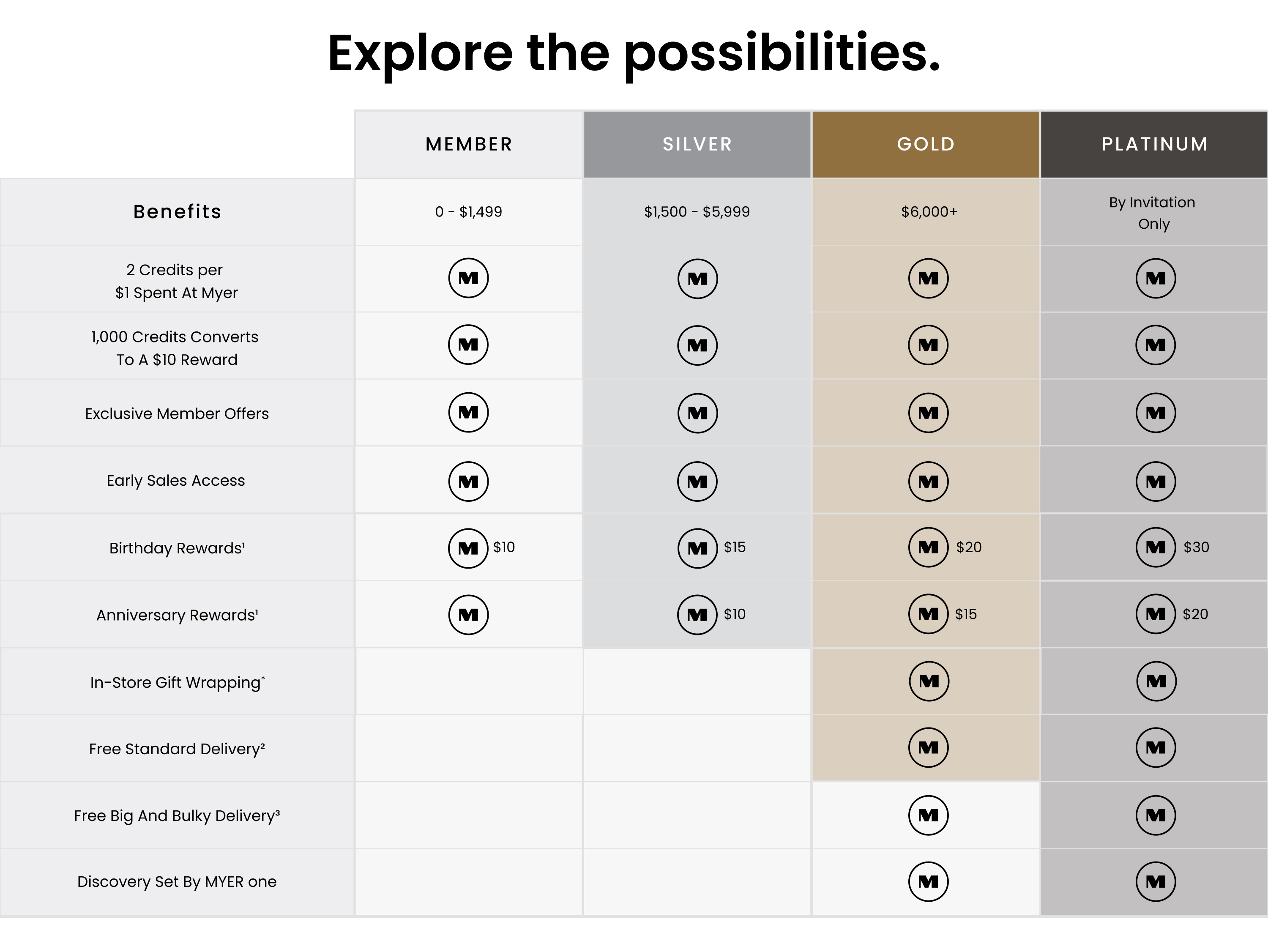 Tier refers to a Member’s membership level based on the Member’s accumulated spend during a Membership Year at Myer Group. Tier levels determine the Benefits and Rewards available to a Member.