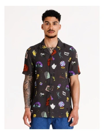 Spooky Season Print Short Sleeve Rayon Shirt in Black