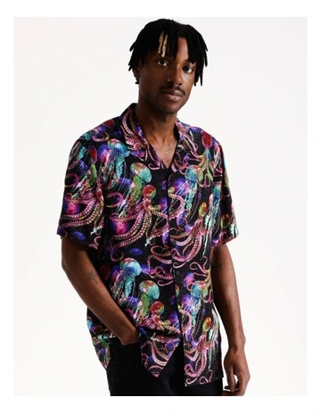 Psychedelic Walk Print Short Sleeve Rayon Shirt in Black